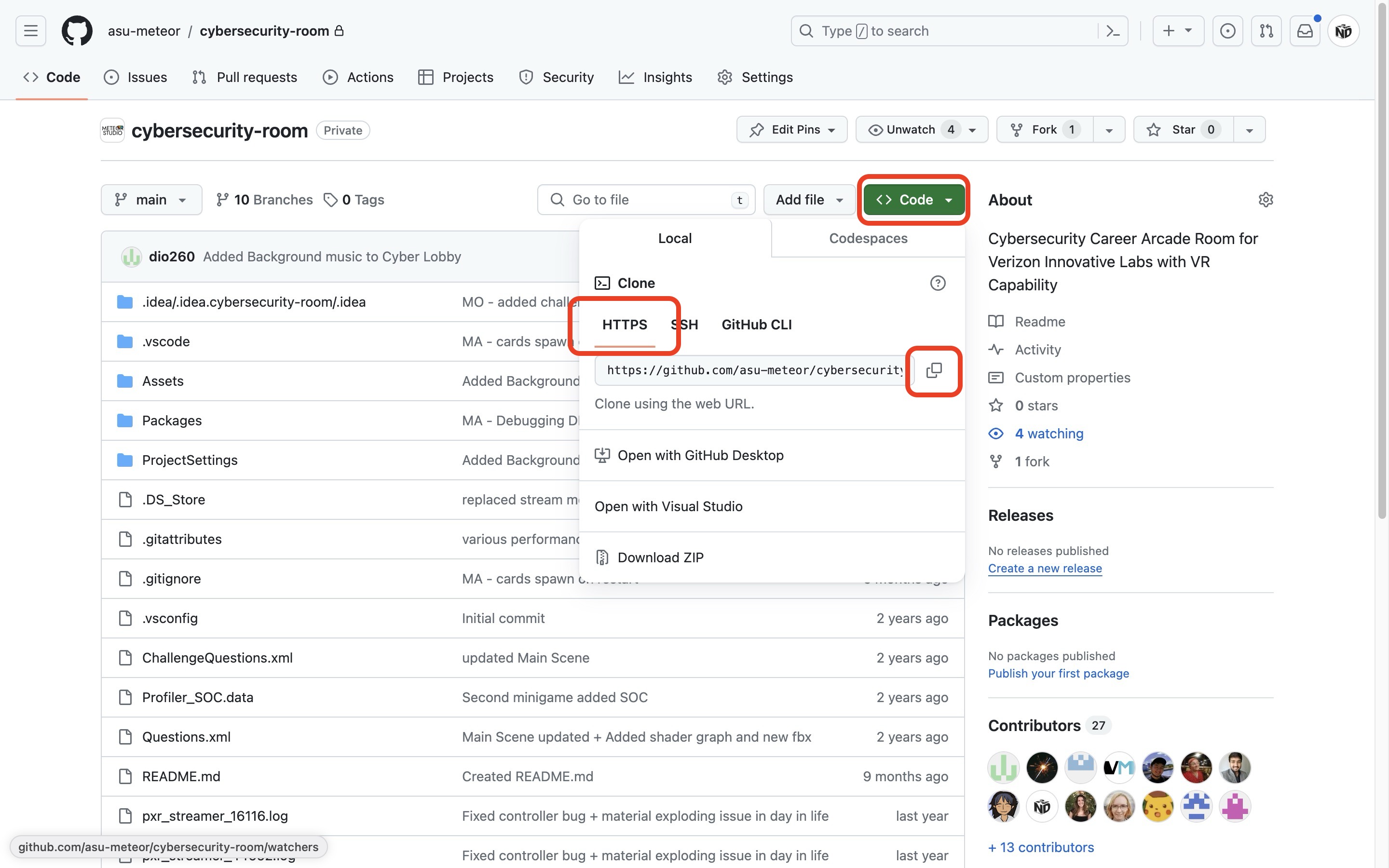 In your terminal, type git clone and paste in the URL that you copied from GitHub. (if you're using Powershell then you will have to right click in the terminal to paste, Ctrl-V does not work). Your command should look something like this git clone https://github.com/asu-meteor/cybersecurity-room.git. Git will prompt you to authenticate with GitHub #needs-revision and after authenticating, Git will download the repository.